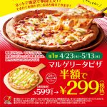 「今だけうれしいテイクアウト半額キャンペーン」の第一弾を、2020年4月23日(木)~5月13日(木)まで開催しています。期間中はテイクアウト限定で、直径約24cm(1~2人前)の「マルゲリータピザ」が通常599円(税別)のところ299円(税別)で購入できます。