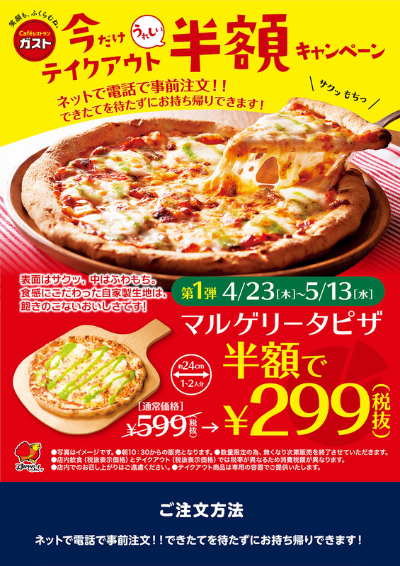 【経済】ガスト:直径24cmのピザが半額の299円! 「マルゲリータピザ」テイクアウト半額キャンペーン 数量限定・5月13日(木)まで