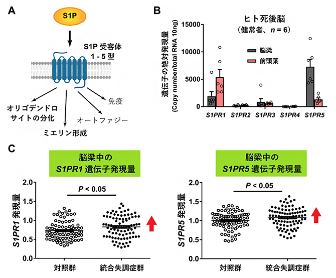 統合失調症では、アミノ酸のセリンの含量変化も報告されているため、セリンが合成に関わるスフィンゴ脂質は脂質の中でも特に興味が持たれる。先行研究で、セラミドの含量が統合失調症患者の皮膚で低下していることが報告されていたが、脳組織を用いてスフィンゴ脂質をセラミド以外にも広げて網羅的に測定した研究はなかった。そこで研究グループは、質量分析装置を用いて100種類以上のスフィンゴ脂質を、統合失調症死後脳の前頭葉(主に灰白質からなる)と脳梁(白質)に分けて定量した。その結果、S1Pだけが統合失調症の脳梁のみで約30%低下していた。この低下には、サンプルの年齢や性別、服薬歴、罹病期間など、疾患以外の因子による影響はなかった。