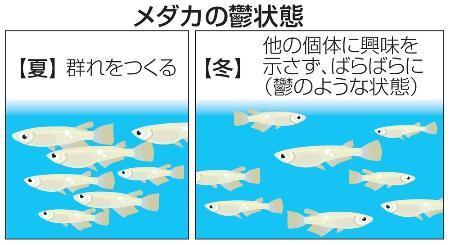 名古屋大などの研究チームが、夏は群れで生活するメダカが冬になると他の個体に興味を示さずばらばらに行動し、鬱のような状態になることに着目し、人の「冬季うつ病」の治療薬候補を見つけたと発表した。