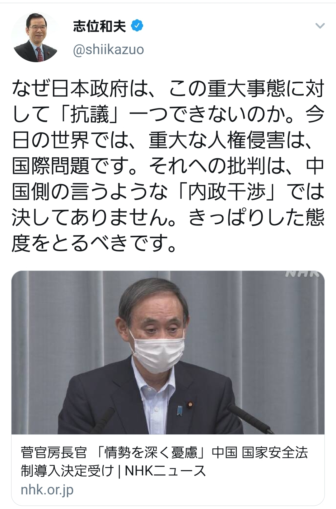 【香港情勢】共産党志位党首「なぜ日本政府は人権侵害に抗議一つできないのか」【菅官房長官】
