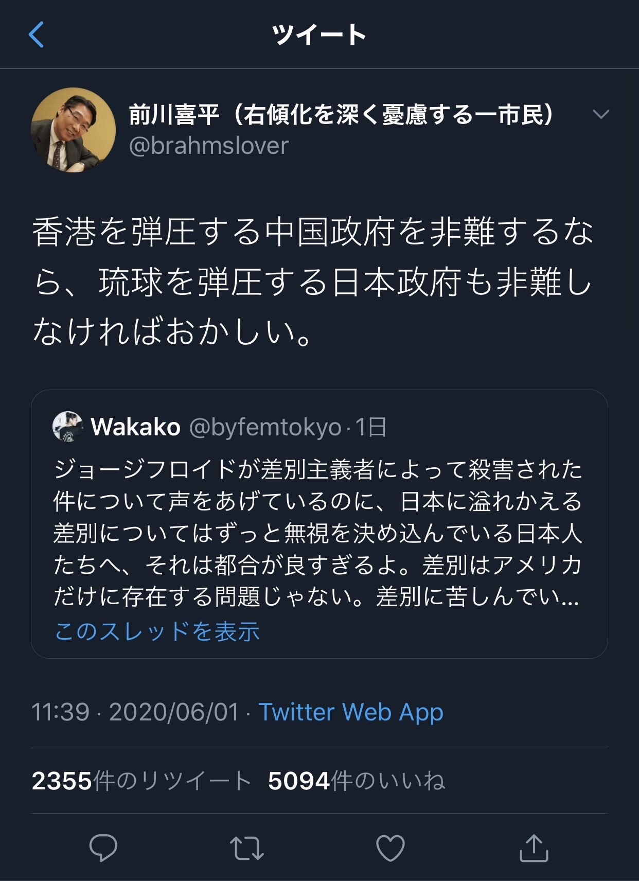前川喜平氏「香港を弾圧する中国政府を非難するなら琉球を弾圧する日本政府も非難しないとおかしい!」