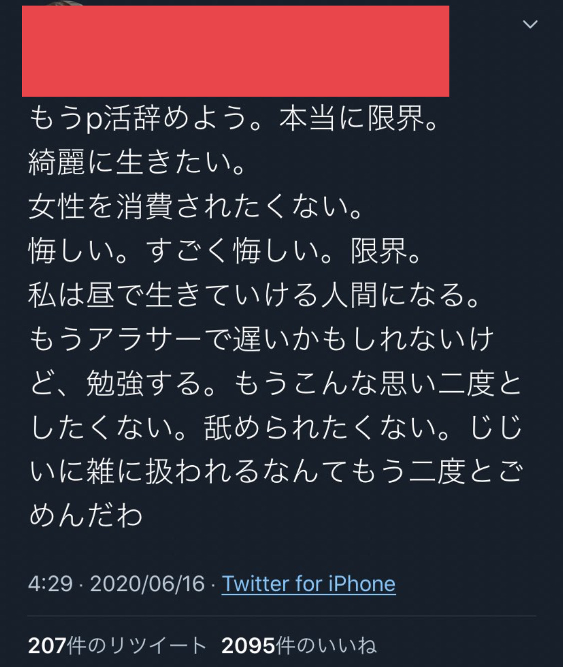 パパ活まんさん「もうパパ活を辞めよう。本当に限界。女性を消費されたくない。じじいに舐められくない」
