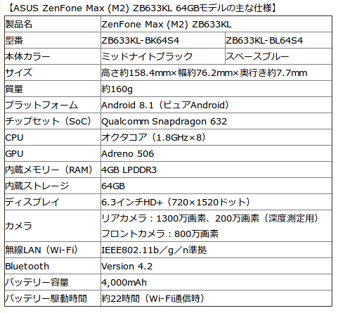 ZenFone Max M2は、4000mAhの大容量バッテリーが特長のAndroidスマートフォン。6.3インチのディスプレイと4GBのメモリー、64GBのストレージを備える。