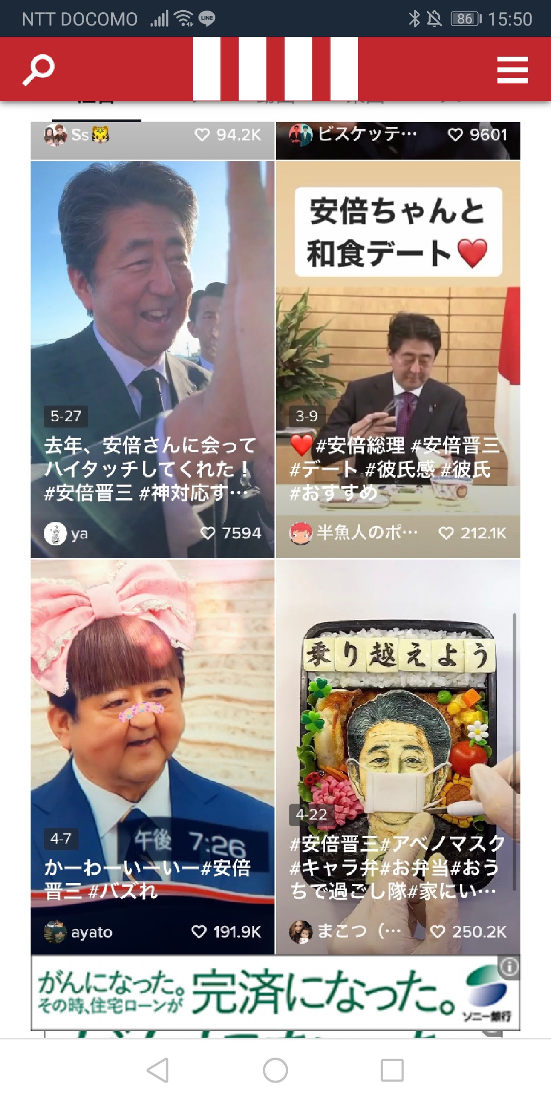 「安倍さんに会ってハイタッチしてくれた!」と喜ぶ動画、自作の「アベノマスクのキャラ弁」を紹介する動画、会見する安倍総理の顔をアプリを使って「かわいく」加工した動画――これらが多いもので20万件以上の「いいね!」を獲得している。