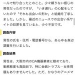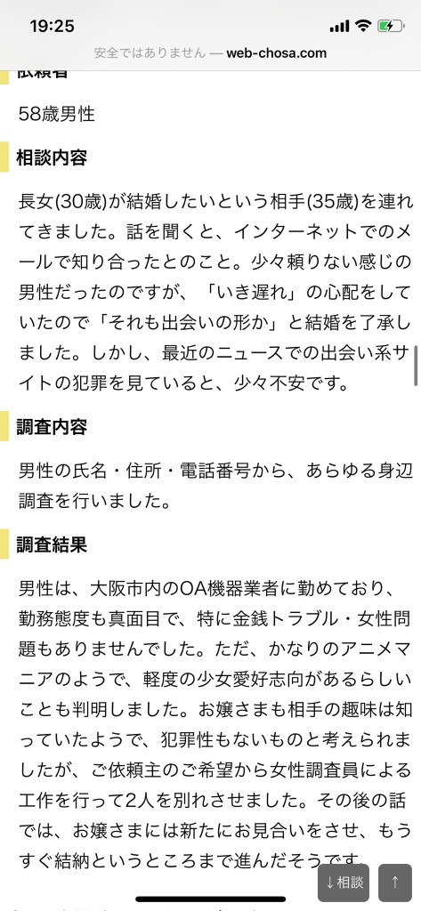 男性は、大阪市内のOA機器業者に勤めており、勤務態度も真面目で、特に金銭トラブル・女性問題もありませんでした。ただ、かなりのアニメマニアのようで、軽度の少女愛好志向があるらしいことも判明しました。お嬢さまも相手の趣味は知っていたようで、犯罪性もないものと考えられましたが、ご依頼主のご希望から女性調査員による工作を行って2人を別れさせました。その後の話では、お嬢さまには新たにお見合いをさせ、もうすぐ結納というところまで進んだそうです。 - 131 : 2020/06/25(木) 07:18:45.81 ID:IQMq9Xjt0