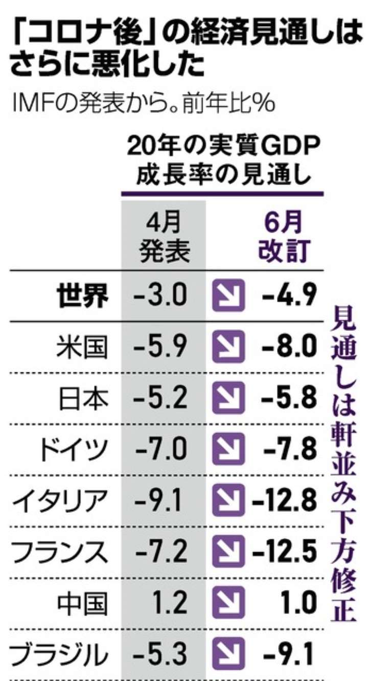 新型コロナウイルスの影響で、世界大恐慌以来の不況を予測した4月時点から、不況の「谷」がより深まる見通しだ。 - 2 : 2020/06/26(金) 15:32:00.59 ID:wrTW54Gf0