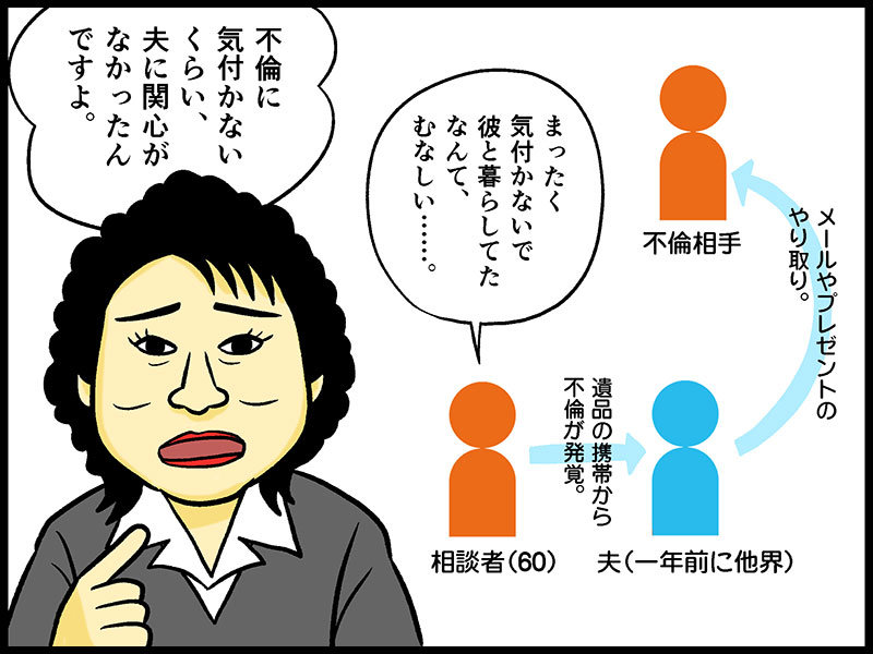 夫の死後、夫が不倫をしていたことを知ってしまった妻からの相談。