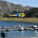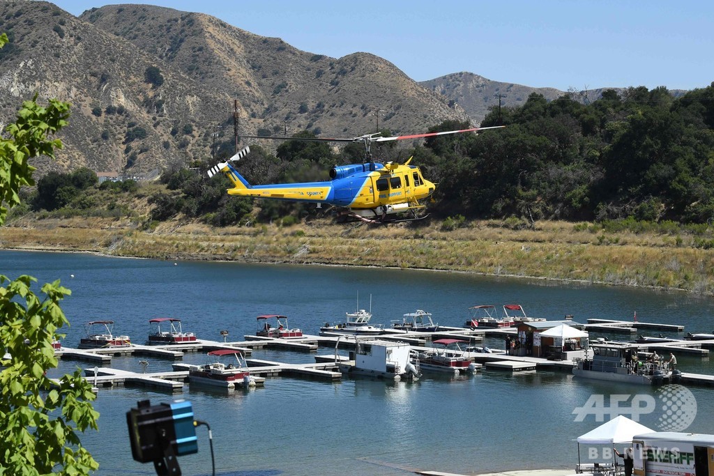 米カリフォルニア州のピルー湖でナヤ・リヴェラさんの捜索に当たるベンチュラ郡保安官事務所のヘリコプター(2020年7月10日撮影)。(c)Robyn Beck / AFP