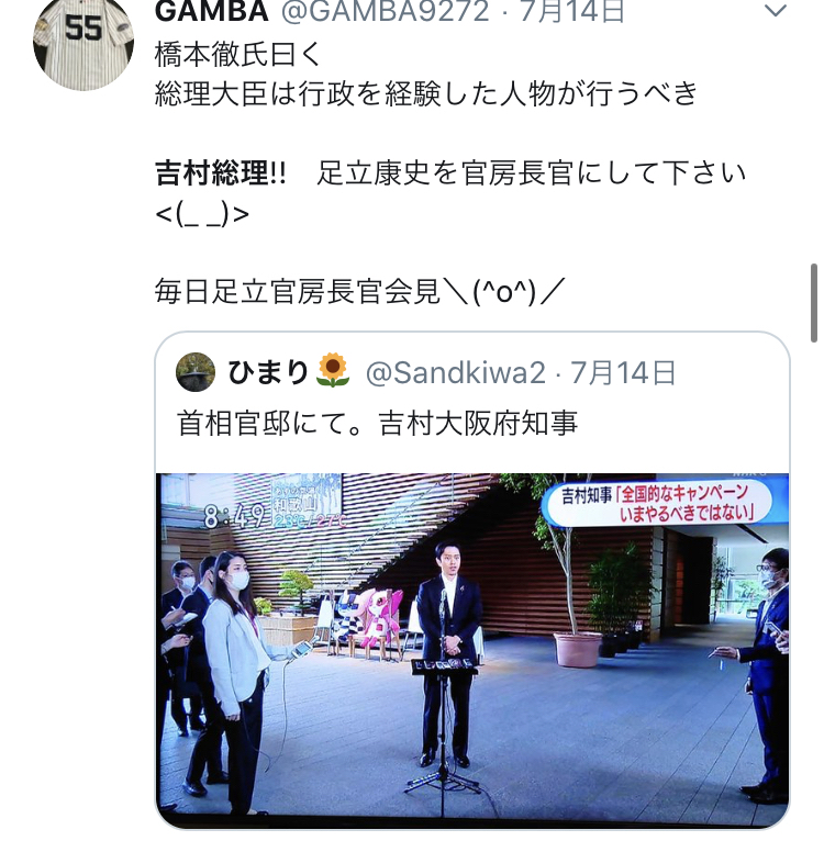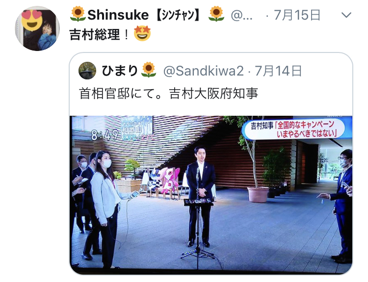 - 最近吉村府知事の評判がいいよな。これは10年後吉村総理大臣あり得るよ。