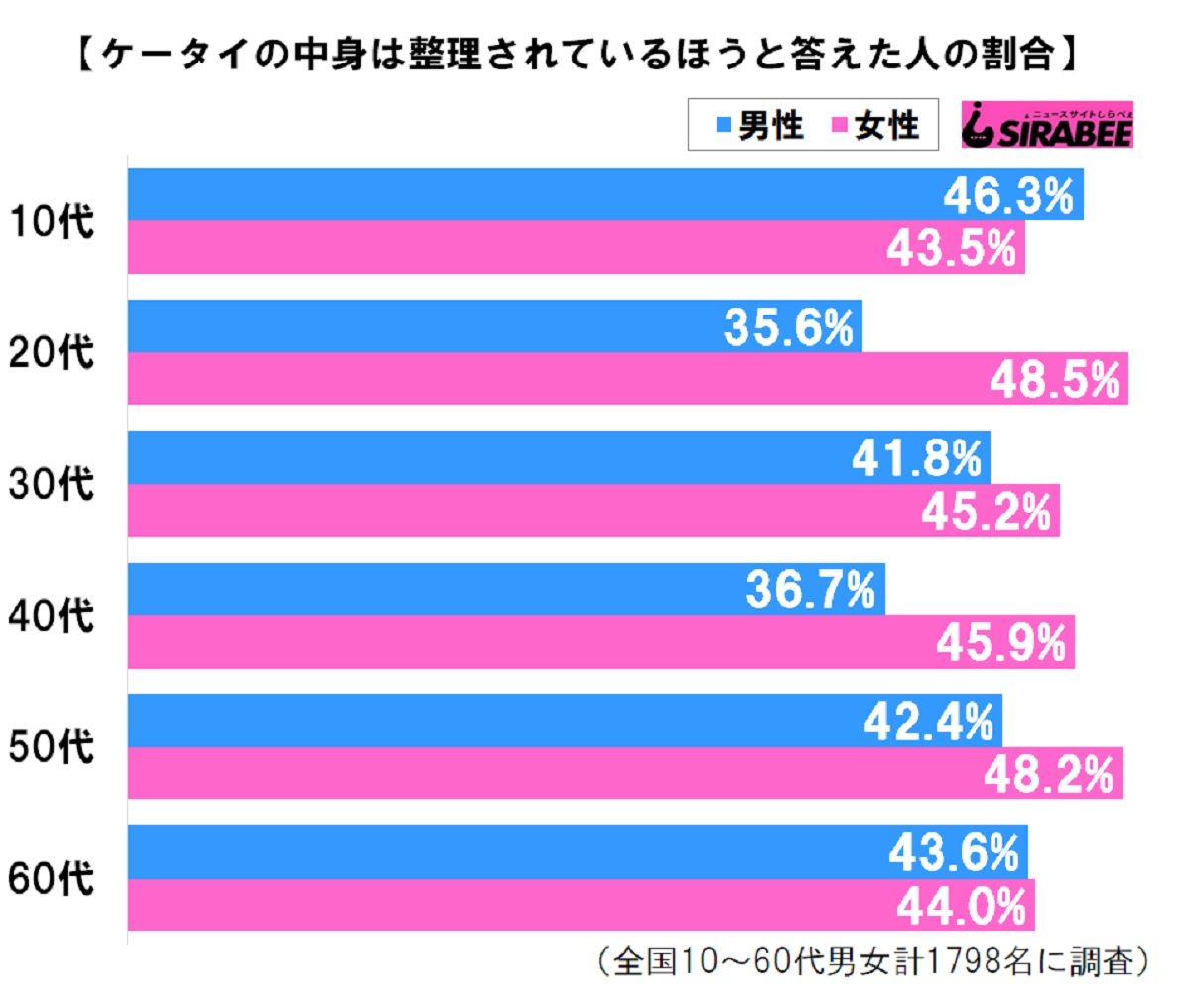 SNSでも意見が真っ二つに割れたスマホの整理整頓問題。しらべぇ編集部が全国10~60代の男女1,798名に調査したところ、4割以上が「携帯の中身は整理されているほう」と回答。男女・年代別で比較すると、10代を除いたすべての年代で女性の割合が高い結果となった。