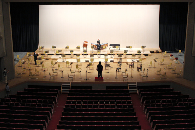 オーケストラは80人編成。編成を広げるために、まず客席側を除く3方の壁面とセットになっている天井の反響板を外した。前後左右に1・8メートルの距離を空けて椅子を並べると、ピアノを含め、左右の端、計10人程度が客席から見えなくなった。オーボエとフルートが席について音を出してみたが、反響板がないため、音が響かず、客席に届かなかったという。