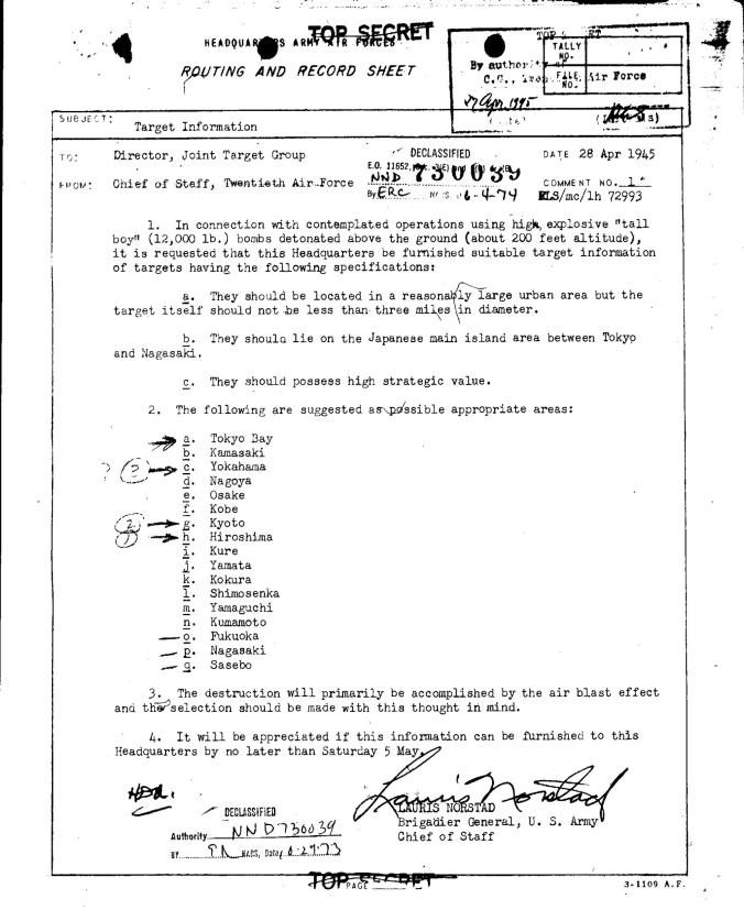 同年5月の会合でリストが修正され、有力候補順に京都市、広島市、横浜市、小倉市、新潟市に絞られた。京都は、大都市でまだ空襲を受けていなかったため、最有力候補に挙げられた。同じくまだ空襲を受けていなかった広島は、中心部に大きな軍事基地があり、周囲が山で囲まれていることから、爆発を「集中させて」破壊力を増幅させるとしてリストに加えられた。