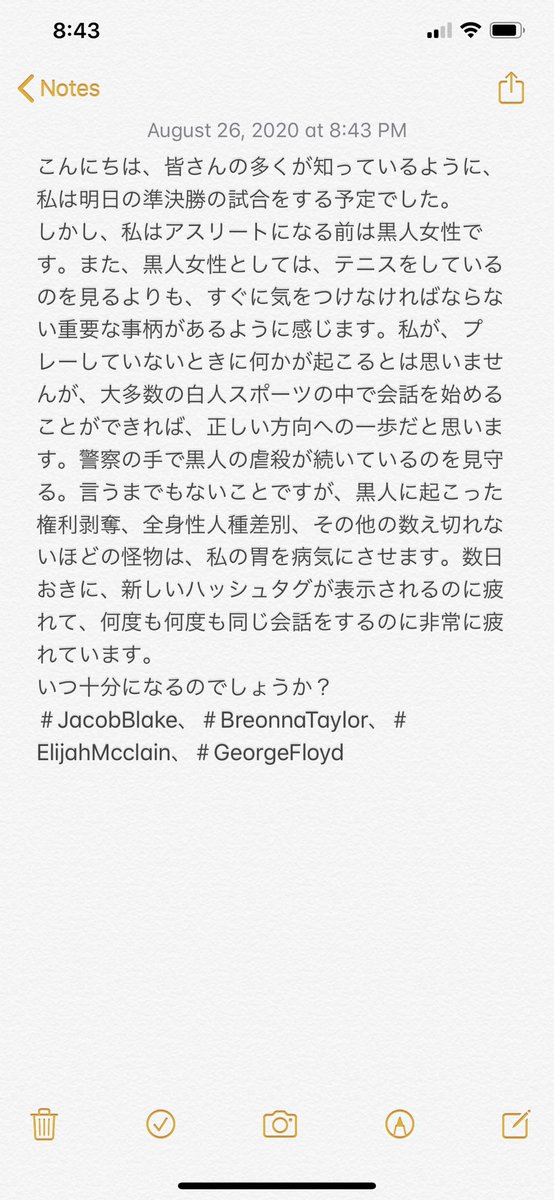 23日にウィスコンシン州ケノーシャで起きた警察官による黒人男性銃撃事件に抗議の意思を示したもので、ツイッターで大坂は「私はアスリートである前に黒人女性です。また、黒人女性としてテニスをするよりも大事なことがあると感じています。プレーしていない時に何かが起こるとは思いませんが、大多数の白人スポーツの中で会話を始めることができれば、正しい方向への一歩だと思います」と、綴った。