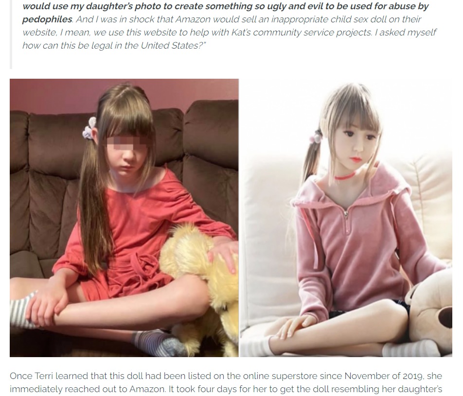 娘の写真が盗用され「ラブドールのモデルに使われた」と訴えた母親のニュースに多くの関心が集まった。母親の名前はテリさん(Terri)とだけ伝えられており、彼女にはカットちゃん(Kat)という8歳になる娘がいる。