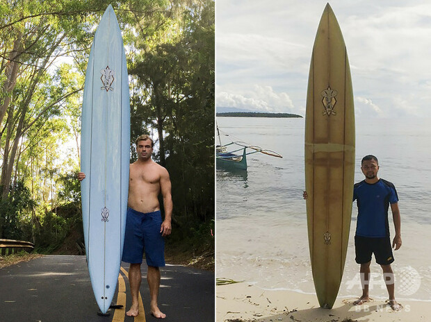 【AFP=時事】サーファーのダグ・フォルター(Doug Falter)さん(35)は、ハワイ・ワイメア湾(Waimea Bay)でサーフボードが巨大な波にのまれてなくなった際、地元の漁師が拾ってくれることを何よりも望んでいた。8000キロ以上も離れたフィリピン南部で発見されるとはまったく想像していなかった。