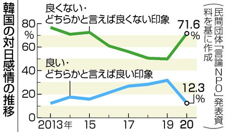 言論NPOによると、2013年の調査開始以降「最悪の水準」という。工藤泰志理事長は元徴用工問題や輸出規制厳格化などを念頭に「政府間の不信の構造がこうした状況を招いた」と指摘。新型コロナウイルスの影響で人的交流が停滞する中、対日感情の悪化が続く恐れがあると警告した。