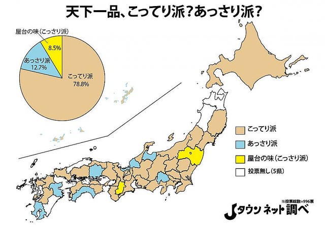 全体の結果が示すように、ほとんどの地域でこってり派が優勢だった。北から南まで、全32地域で人気を席巻している。こってりへの投票数が100%を占める地域も多く、やはりみなさん、あの麺から離れることを知らない濃厚スープのとりこになっているようだ。