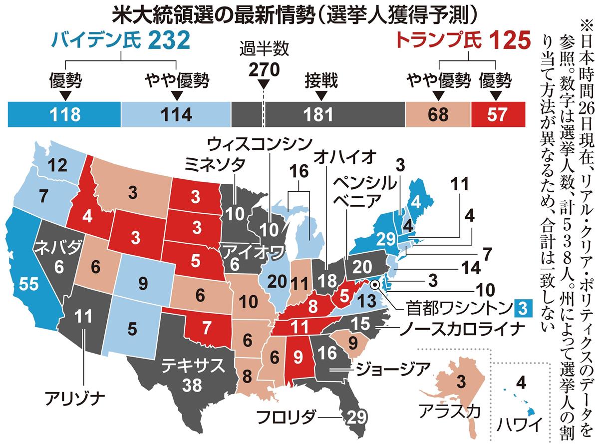 ただ、同氏が激戦州のうち最大の選挙人(29人)を抱える南部フロリダ州で敗れたり、南部ノースカロライナ(15人)や西部アリゾナ(11人)といった他の激戦州も落としたりした場合、再選は絶望的となる。
