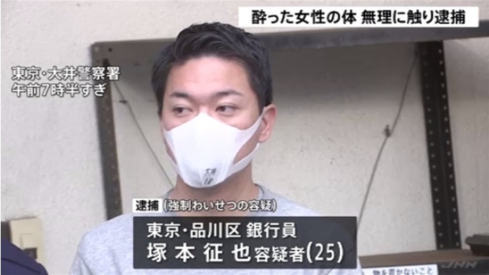 酒に酔った女性の体を無理やり触ったとして、銀行員の男が警視庁に逮捕されました。品川区の銀行員・塚本征也容疑者(25)は、7日午前6時ごろ、