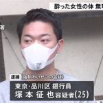 酒に酔った女性の体を無理やり触ったとして、銀行員の男が警視庁に逮捕されました。品川区の銀行員・塚本征也容疑者(25)は、7日午前6時ごろ、