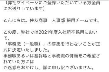 - 住商がコロナショックの影響で事務職取らん模様