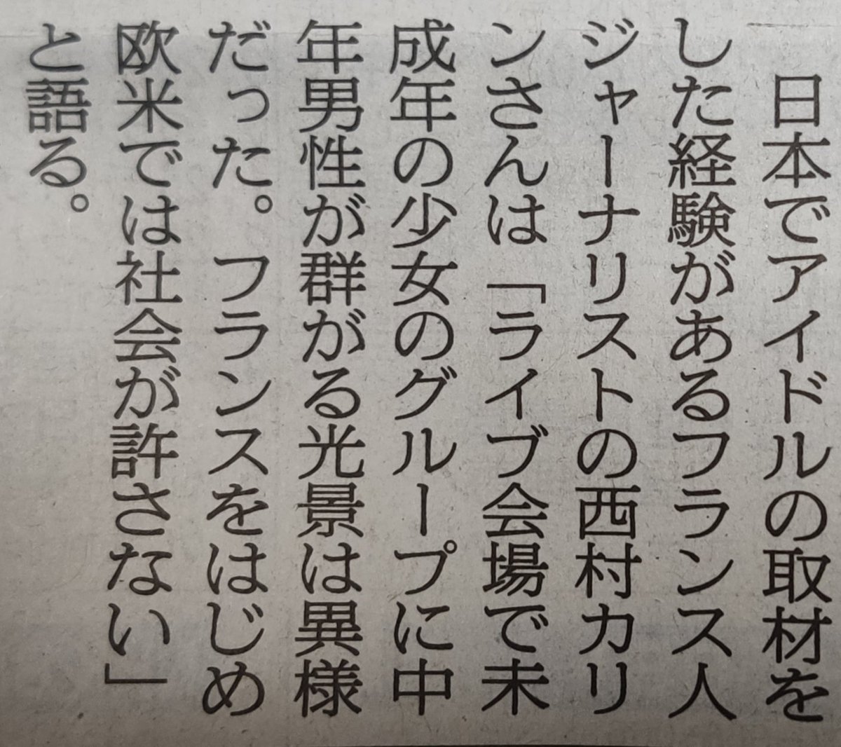【悲報】フランス人ジャーナリスト「未成年アイドルに中年が群がる日本は異常。欧米では社会が許さない」