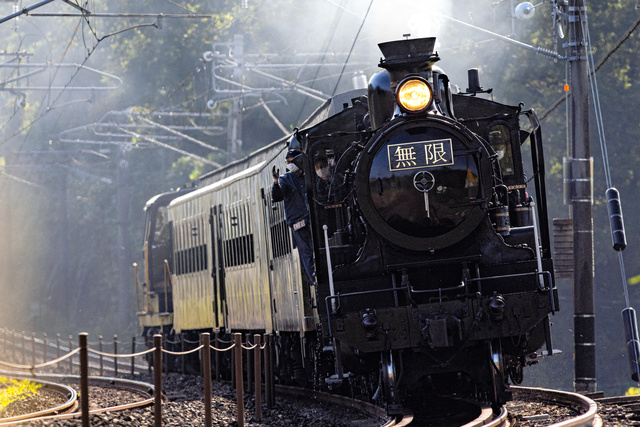 「無限」のヘッドマークをつけて走行する「SL鬼滅の刃」