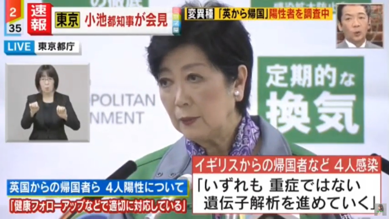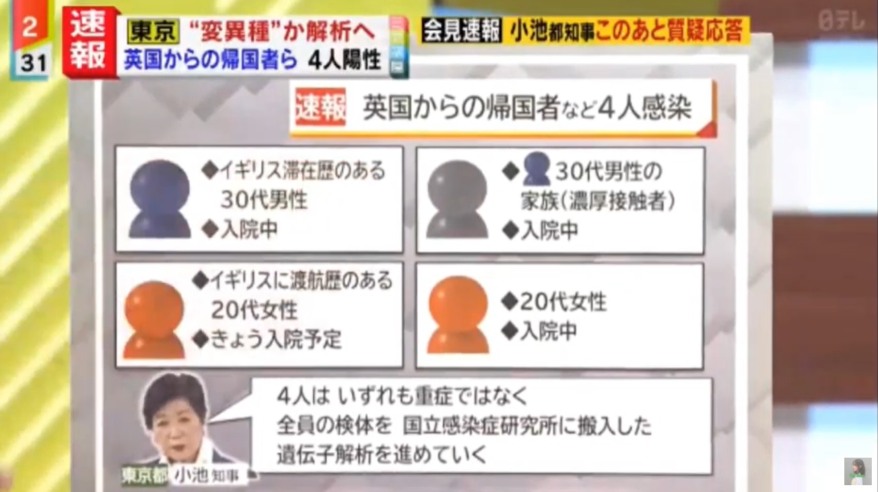【速報】東京でイギリスからの帰国者、コロナ陽性4人判明。早速、家族にも広がる。変異種か確認中・・