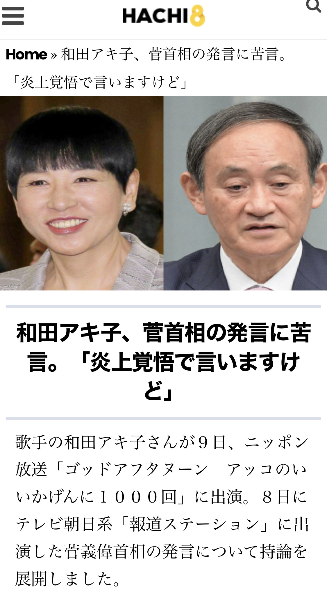 和田アキ子、総理大臣に噛みつく「炎上覚悟で言いますけど、世界中コロナの時に五輪のことを考えている国なんてあるか」