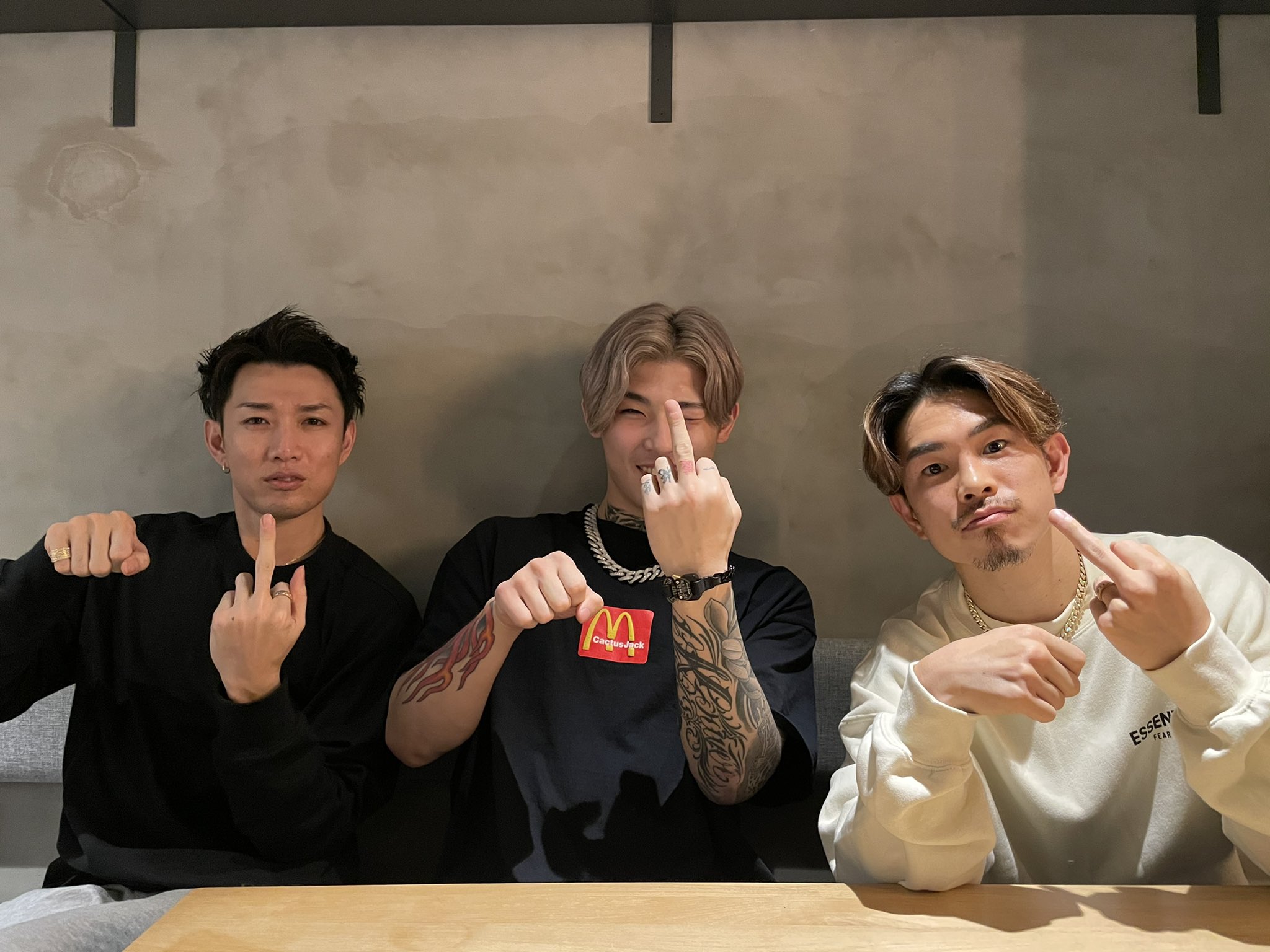 一翔も同様に左手の中指を立てたポーズをとっている。