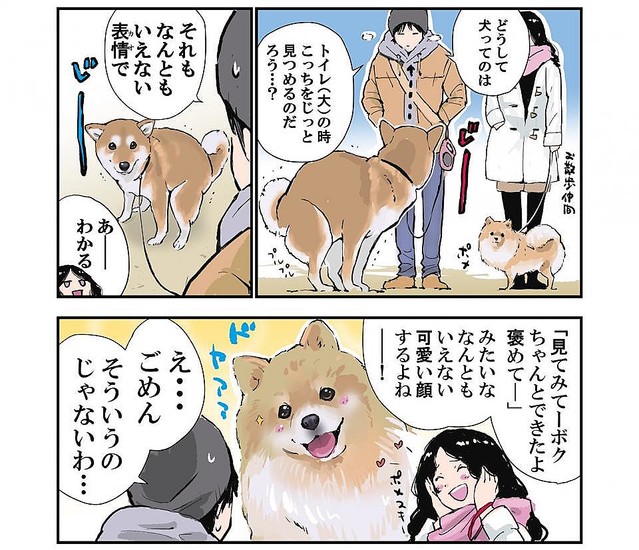 ある日、お散歩仲間と一緒にペットの柴犬の散歩をしていた石原さん。愛犬が用を足そうとしながら「じー」とこちらを見つめる姿を見て、ふと、