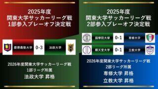 芸スポ【関東大学サッカー1部・2部プレーオフ】来季は法政大が1部、専修大、立教大が2部に昇格 慶應義塾大は2部、國學院大、順天堂大は3部降格