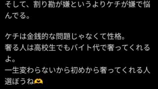 嫌儲女子「私たちは割り勘が嫌なんじゃない!ケチが嫌で悩んでいる。奢る人は高校生でもバイト代で奢る」